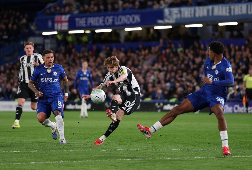 落后的切尔西并未慌乱,凭借恩佐、内托领衔的中场梳理,逐渐稳住阵脚。第28分钟,恩佐前场斜传撕开防线,古斯托前插得球后劲射,皮球被门将扑挡后仍窜入球网,切尔西迅速扳平比分,1-1!蓝军的反击简洁高效,充分利用边路空档,展现出欧冠强队的韧性。